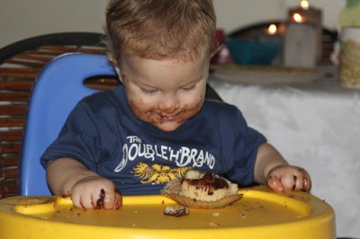 | He LOVED his first birthday cupcake. Went at it face first. 🙂 |