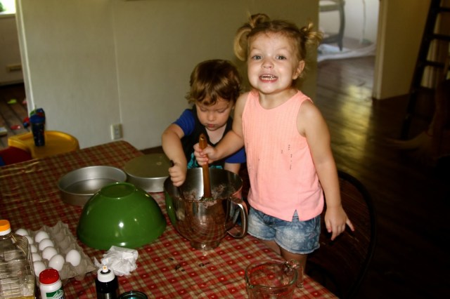 So, this brings me to my every-day-Tuesday-morning in the jungle. And, though a cake is not really how I had planned to give thanks, it made perfect sense to our three year old. While we baked the cake together, we talked about Izzy’s time at the hospital. She showed us her scar, again, and we thanked God for healing. Scars can remind us of so much; we chose this day to remember His Grace. As I set the pots, and pans out on the table, my two little helpers climbed up on chairs and I arranged the bowls around them. We were nearly all ready, when I remembered I had to get the butter and a few other things from the next room. So, I left them at the table for just a few minutes, and when I walked back into the room, I literally stood still and just watched.