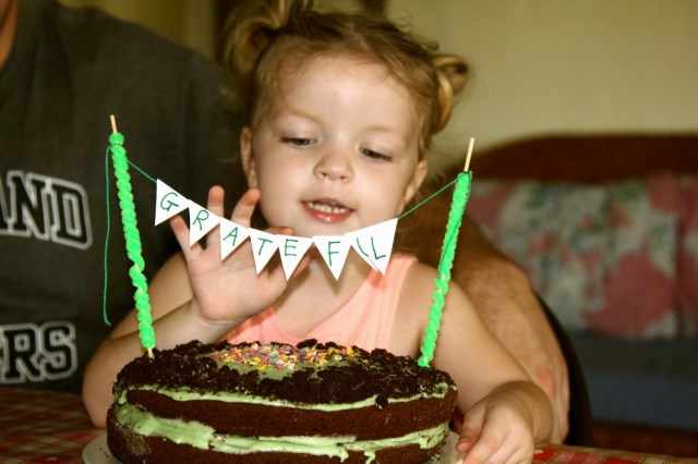 The green frosting was made (and then covered with multiple toppings), we are not real fancy about cakes at our house, and so we let the Miss Izzy help decorate it. There were no cake toppings saying; “Celebrating-6-months-free-from infection” out here in the jungle, and so we chose to write, “Grateful” instead. Izzy was thrilled, and Judah was hungry, so with a few of our friends gathered around the table, we cut the cake and Danny said grace, thanking God for His.