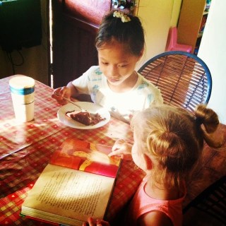 So, this brings me to my every-day-Tuesday-morning in the jungle. And, though a cake is not really how I had planned to give thanks, it made perfect sense to our three year old. While we baked the cake together, we talked about Izzy’s time at the hospital. She showed us her scar, again, and we thanked God for healing. Scars can remind us of so much; we chose this day to remember His Grace. As I set the pots, and pans out on the table, my two little helpers climbed up on chairs and I arranged the bowls around them. We were nearly all ready, when I remembered I had to get the butter and a few other things from the next room. So, I left them at the table for just a few minutes, and when I walked back into the room, I literally stood still and just watched.