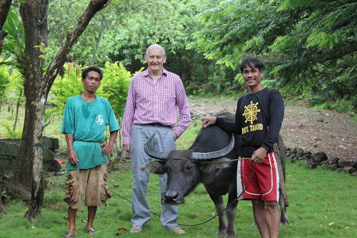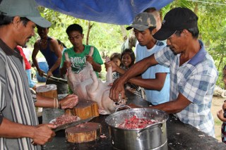 A few days before the party, two guys Augustine and Silit, went out into the jungle to get wood, bringing it all up to our house on a watter buffalo. They cook everything, rice and all, over open fires, which they knew would require a lot of wood. The afternoon before the party about 5 or 6 guys came to the house to put up a temporary covering in case it rained, it had been raining the days previous to the party but we were so thankful that the rain stayed off so we could all enjoy eating out on the grass.