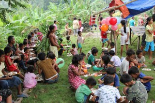 Saturday morning, the day of the party, Danny was up at 5am and down at Austine and Lilibeth’s house, they had kindly offered their home as a place to prepare and cook all the food, they knew how smokey it would be and didn’t want us to be “smoked out” of our house. When Danny went down, about 25 people were already there, men were killing and preparing the pig, ladies cutting vegetables and cooking rice. Everything looked so organised and everybody knew their place. I had to laugh to myself when I went down and had a look at all that was going on, at home to throw such a big event we would of had a committee, and there would have been emails back and forth, and flyers passed out, texts sent and people cced on it all, here they just showed up and got to work, and it was great! Actually the hours of preparations and cooking were nearly more fun than the party. When I dropped down at 9am or so (break time), a group of older ladies who were in charge of cooking the rice were huddled around a bowl of something and certainly enjoying it…kind of like when someone at home goes on a “Starbucks run” for all the ladies working in the kitchen, they had “that” look about them. Anyway, when I inquired about the contents of the bowl, it was not on the same par as a low fat caramel latte, it was in fact the pigs tail they were sharing out! I was surprised to see how much meat was in it, and for the record I am no hardened missionary, I had to turn it down, I could not stomach that any time of the day, never mind 9am. 🙂