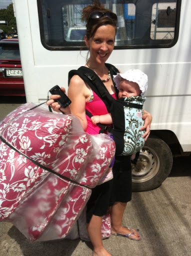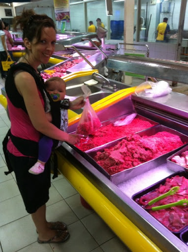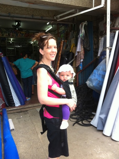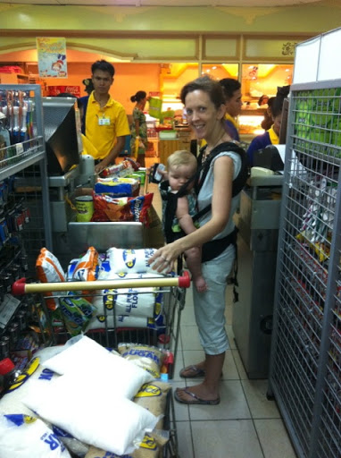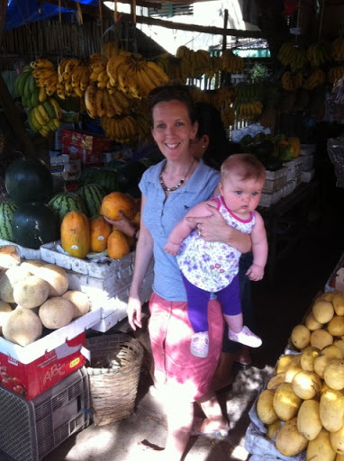 | At the fruit market. Buying LOTS of fruit and vegetables. As there is no “ready made” baby food here I am having to make it all for Izzy. There is not much fruit and vegetables available in the village so we bought it all in town to take with us for the next few months. |